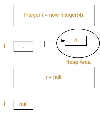 Demo my_ob_1 = new Demo(); System.out.println("Demo object one has been created"); Demo my_ob_2 = new Demo(); System.out.println("Demo object two has been created"); my_ob_1.i = my_ob_2; my_ob_2.i = my_ob_1;Integer i = new Integer(4); // the new Integer object is reachable via the reference in 'i' i = null; // the Integer object is no longer reachable.