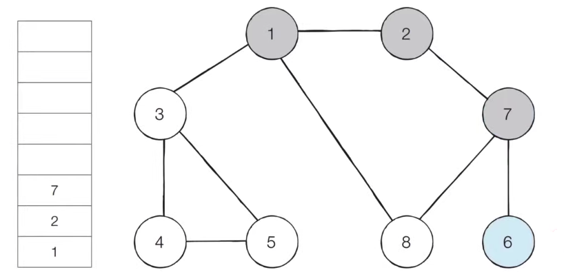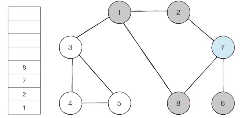 - [Step 6] 스택의 최상단 노드인 '7'에 방문하지 않은 인접 노드 '8'이 있다. 따라서 '8'번 노드를 스택에 넣고 방문 처리를 한다
