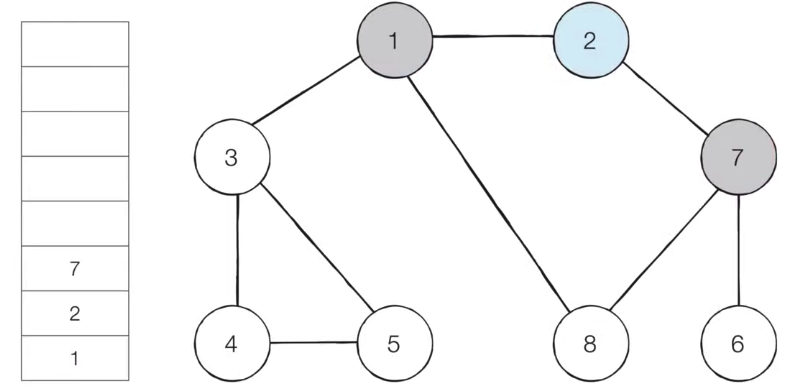 - [Step 2] 스택의 최상단 노드인 '1'에 방문하지 않은 인접 노드 '2', '3', '8'이 있다. 이 중에서 가장 작은 노드인 '2'를 스택에 넣고 방문 처리를 한다