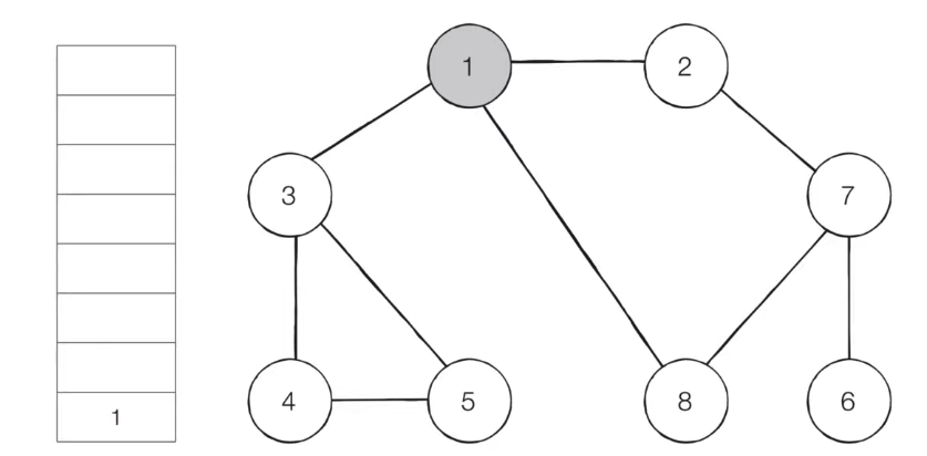 - [Step 1] 시작 노드인 '1'을 스택에 삽입하고 방문 처리 한다