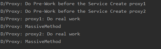 proxy 클래스 객체를 생성할 때 사전작업을 진행했다는 의미의 Do Pre-work가 출력되는 것을 확인 할 수 있고, MassiveMethod 실행 전 Do real work로 Service 생성자에서 필요한 작업을 진행했다는 의미의 로그를 확인할 수 있다.